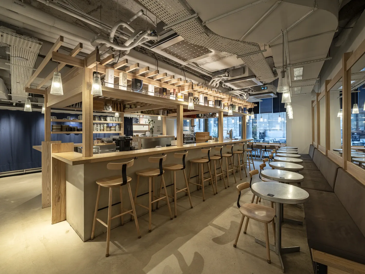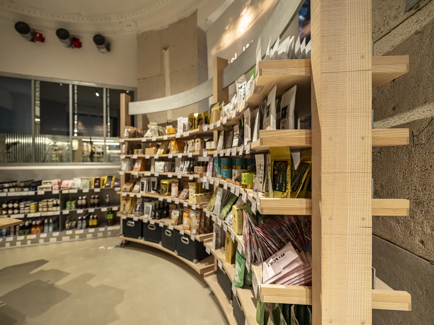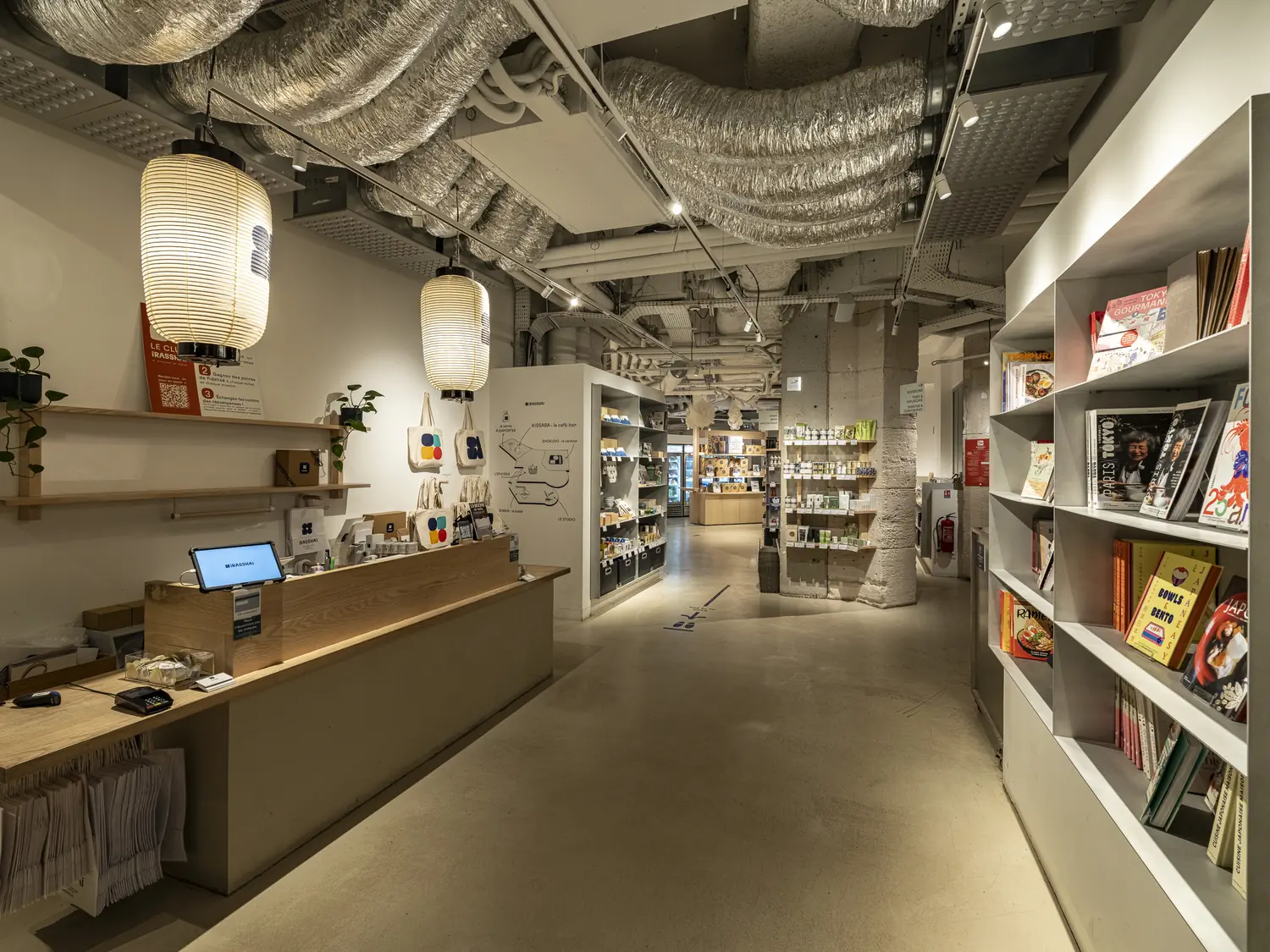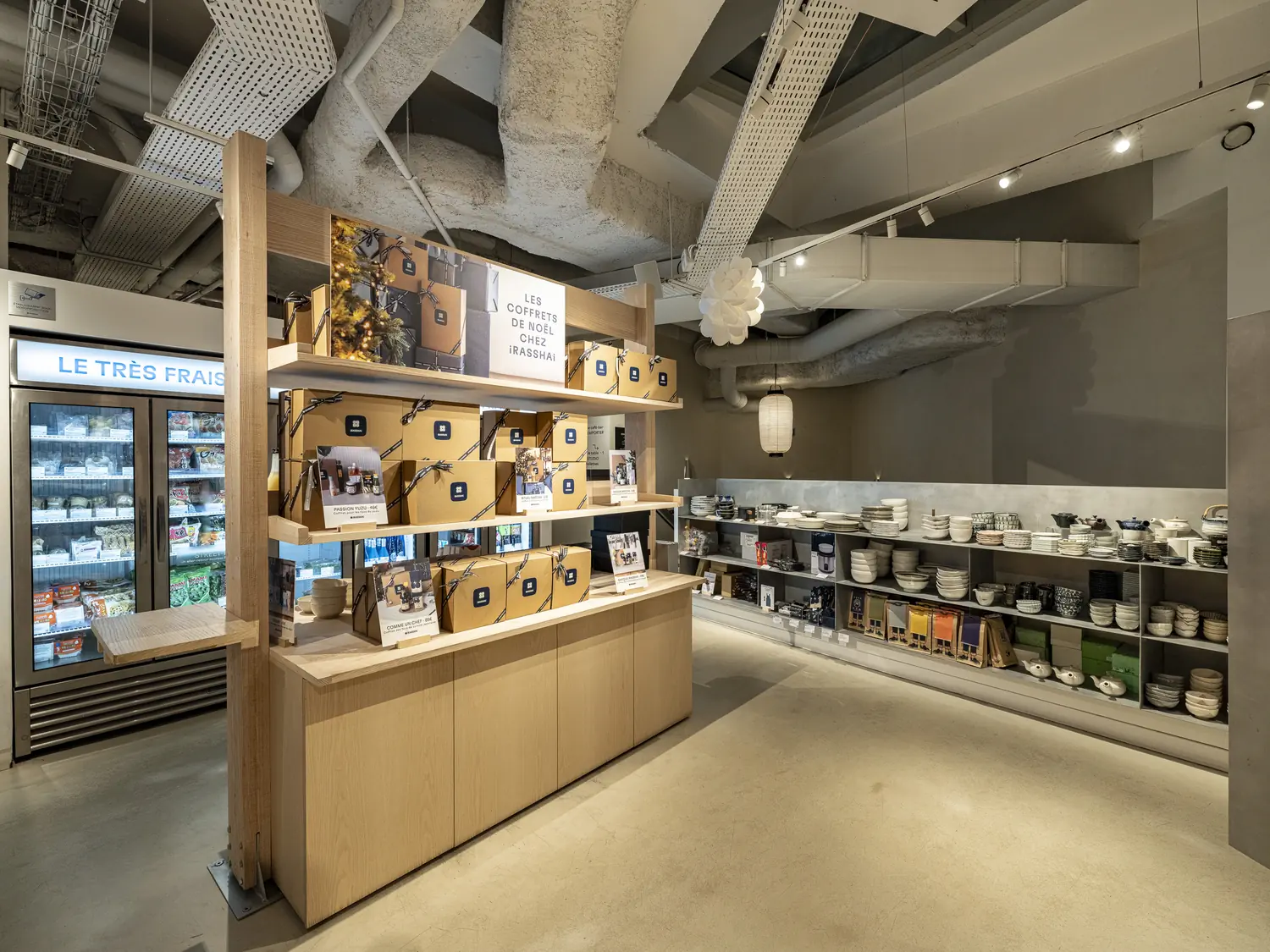 Réparti sur 2 étages, ce concept store propose des zones de restauration presque comme un foodcourt mais également une grande épicerie boutique, le tout dédié à la gastronomie japonaise. Le lieu colle également dans son architecture aux codes du design japonais contemporain avec des matériaux bruts et raffinés : plafonds à la technique apparente, pierres structurelles apparentes, enduits muraux en terre crue, agencements et meubles en bois clair et aluminium, miroir, sol en béton ciré, espaces de restauration initmistes tout en bois avec lumière tamisée... Un chantier de grande ampleur en plein coeur de Paris avec tous les corps d'état, du plus technique jusqu'aux menuisiers pour l'agencement.